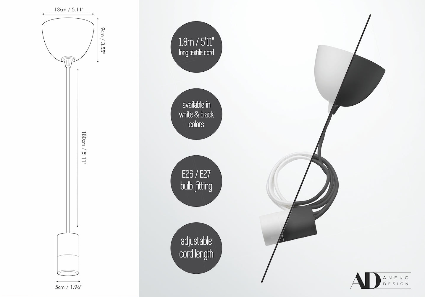 Each design comes with a 1.8m (5'11") long cord kit that's available in either white or black color. Kit comes with a white/black E26/E27 socket and ceiling canopy. Need a longer cord or prefer to use a plug-in cord instead? No problem! Simply contact us for more information.